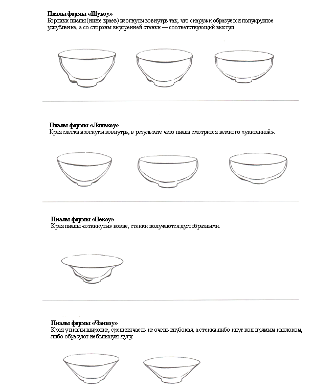 Также были специальные пиалы стандартного размера, использовавшиеся для определения качества чайного листа (процедура «доуча»3) и называющиеся «Шукоувань» (кит. 束口碗, пиньинь Shùkǒuwǎn, дословно «Пиала со связанными краями»), диаметр по краям у таких пиал составлял стандартные 13,5 см.